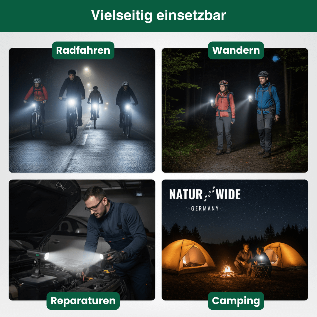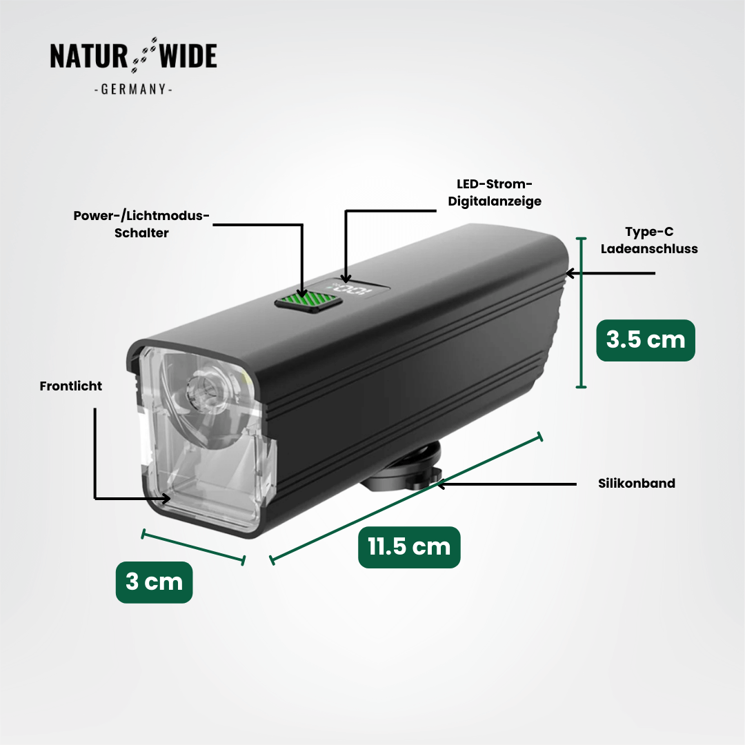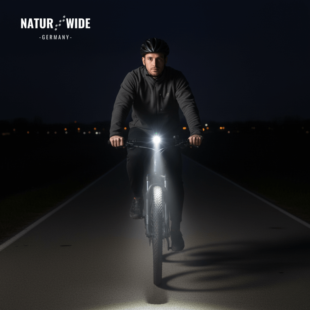 Mit unserem Fahrradlichter-Set bist du bei jeder Fahrt bestens ausgestattet. Das 1200 Lumen Frontlicht sorgt mit Dual-Lichtquelle (Fern- & Abblendlicht) für klare Sicht – ob auf der Straße oder im Gelände. Das ultrahelle Rücklicht macht dich auch bei schlechten Lichtverhältnissen unverkennbar sichtbar und erhöht deine Sicherheit im Straßenverkehr.