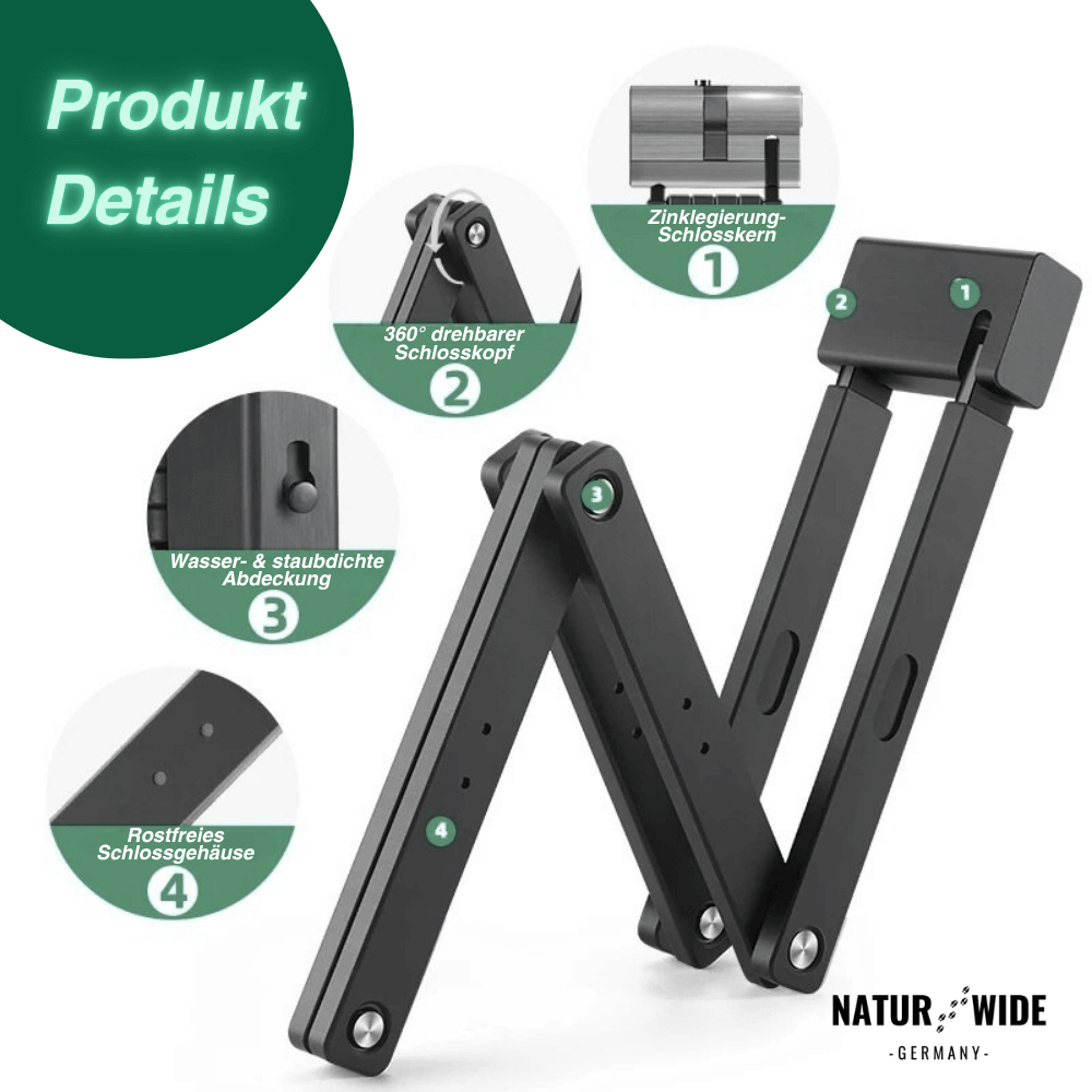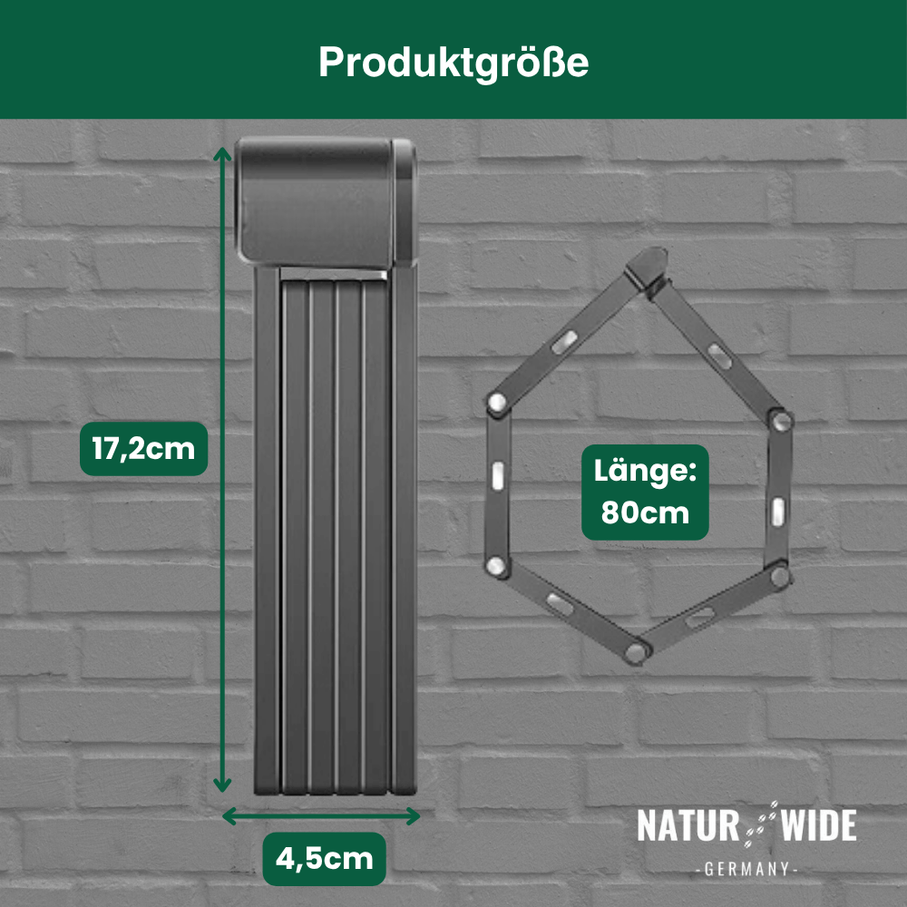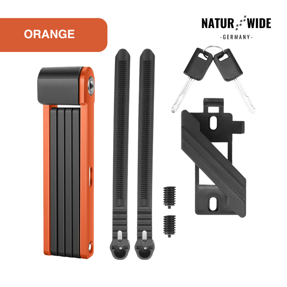 Das faltbare Fahrradschloss von Naturwide bietet dir zuverlässigen Schutz in einem kompakten Format. Hergestellt aus hochwertigem Stahl und verstärkt mit Zinklegierung ist es extrem widerstandsfähig gegen Aufbruchversuche – perfekt für den täglichen Einsatz in der Stadt oder auf Tour.