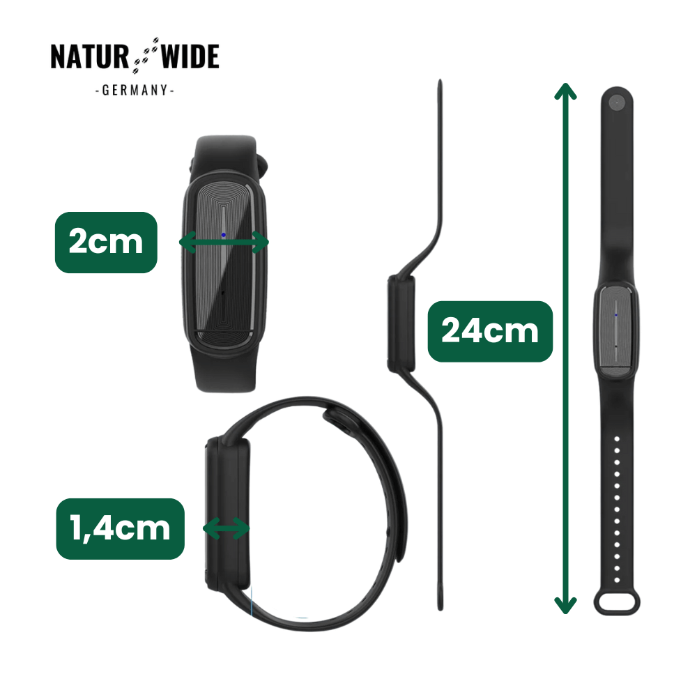 A: Eine vollständige Ladung reicht für bis zu 150 Stunden Schutz. Im Standby-Modus bleibt das Armband bis zu 6 Monate einsatzbereit. Perfekt für lange Outdoor-Trips!